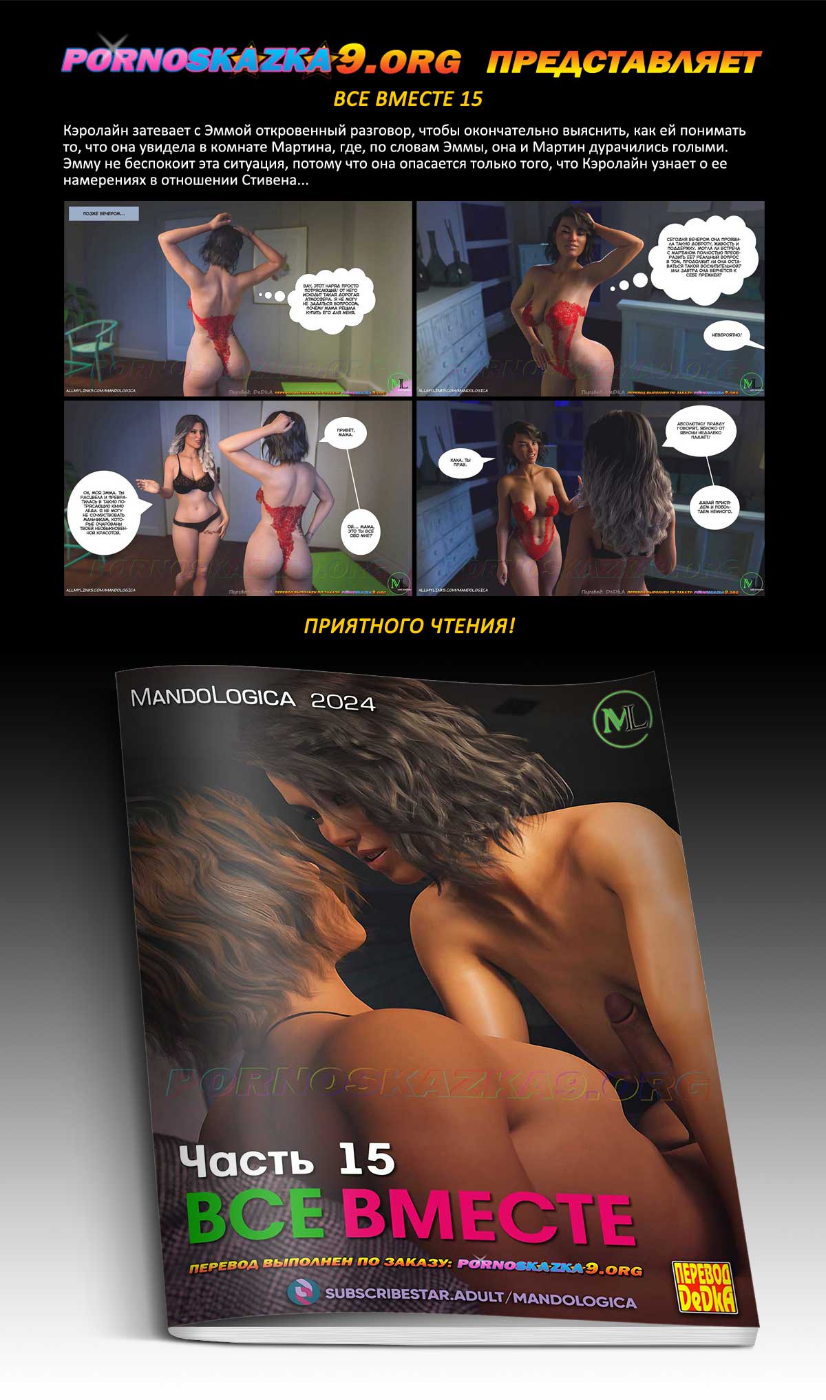 Порно комикс «Все вместе. Часть 15.» Кэролайн затевает с Эммой откровенный разговор, чтобы окончательно выяснить, как ей понимать то, что она увидела в комнате Мартина, где, по словам Эммы, она и Мартин дурачились голыми. Эмму не беспокоит эта ситуация, потому что она опасается только того, что Кэролайн узнает о ее намерениях в отношении Стивена…